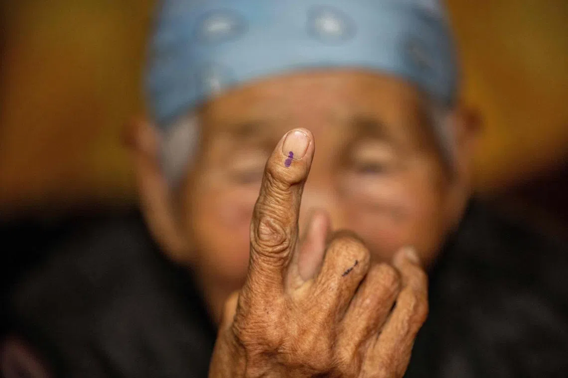 An elderly woman shows the mark on her finger after she voted from her home with portable voting box, one day ahead of the Mongolian parliamentary elections in Ulaanbaatar, the capital of Mongolia on June 27, 2024.