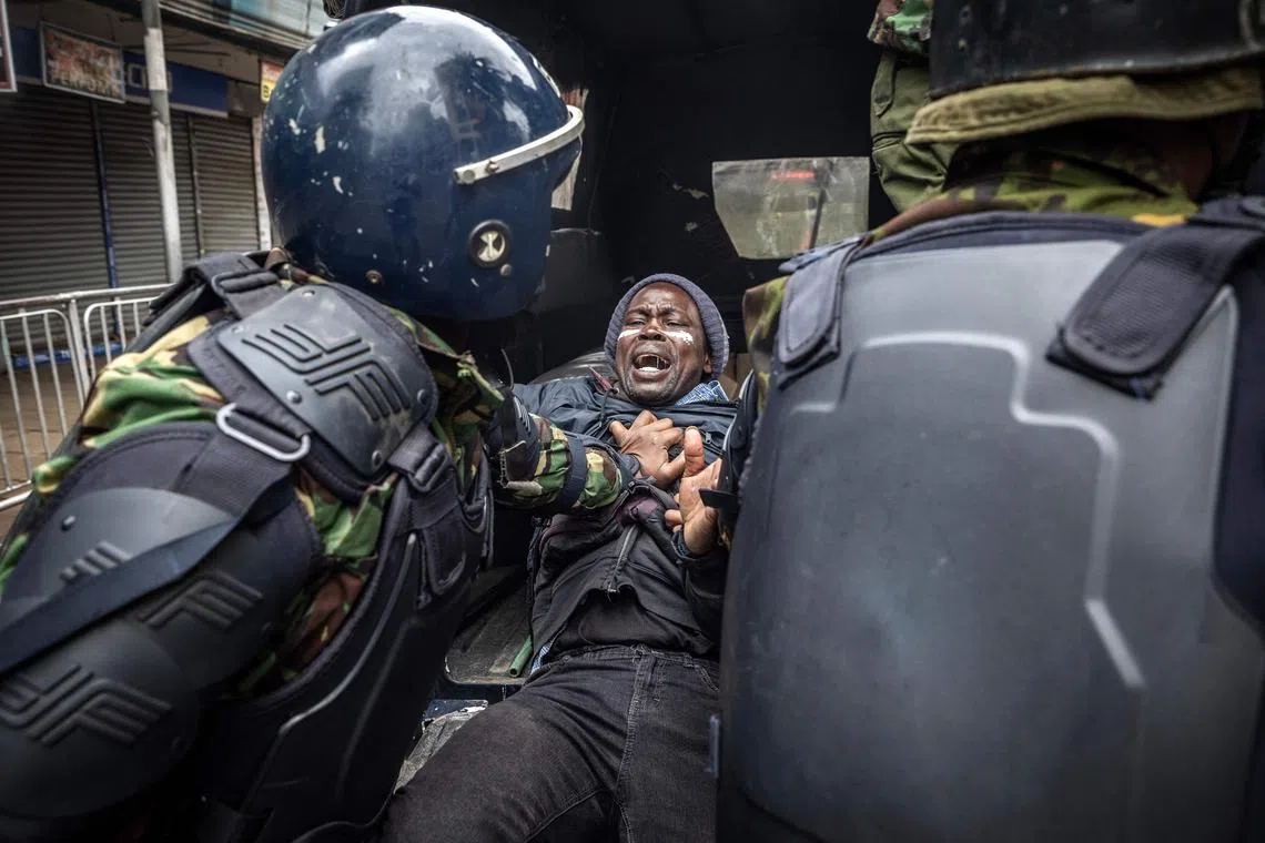 A man reacts as Kenya Police officers arrest him while stopping people from gathering for a planned demonstration called after a nationwide deadly protest against a controversial now-withdrawn tax bill left over 20 dead in downtown Nairobi, on June 27, 2024.