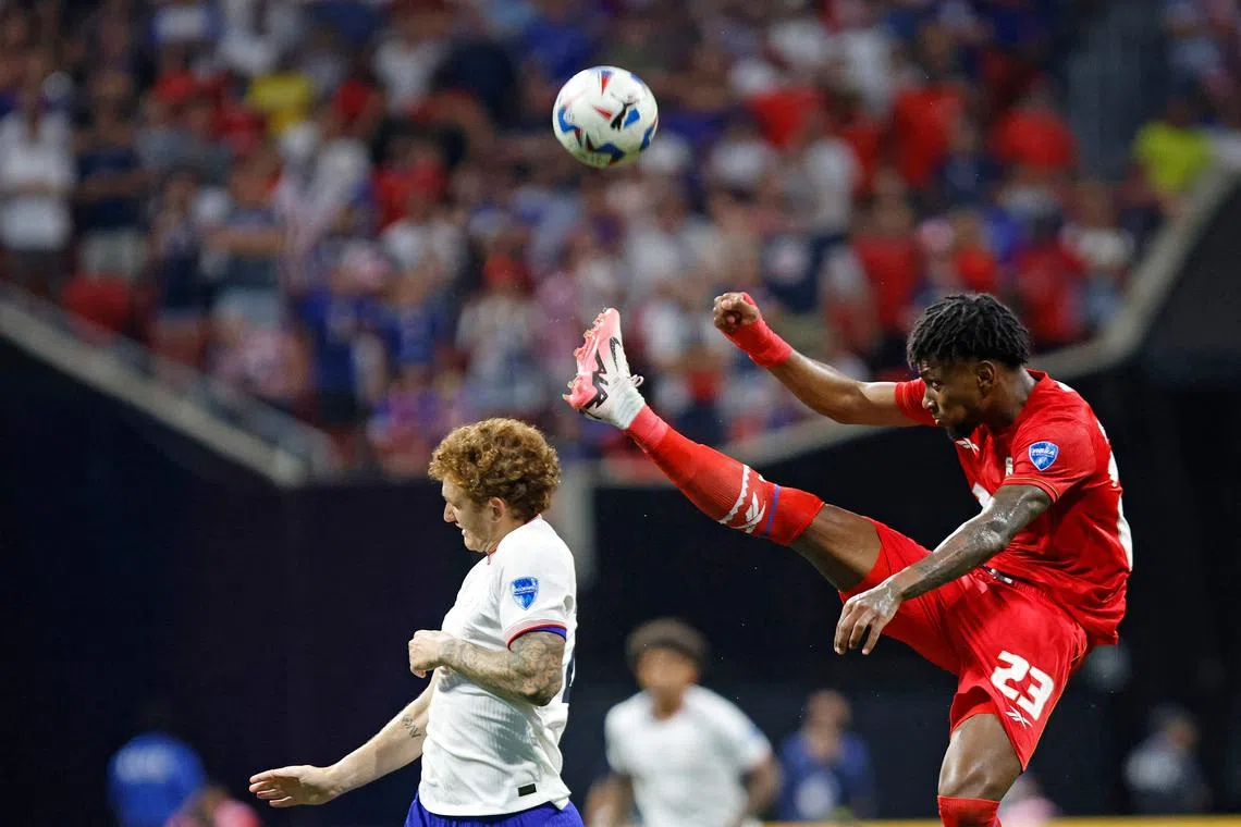 USA's forward Josh Sargent (L) fights for the ball with Panama's defender Michael Murillo during the Conmebol 2024 Copa America tournament group C football match between Panama and USA at Mercedes Benz Stadium in Atlanta, Georgia, USA, on June 27, 2024.