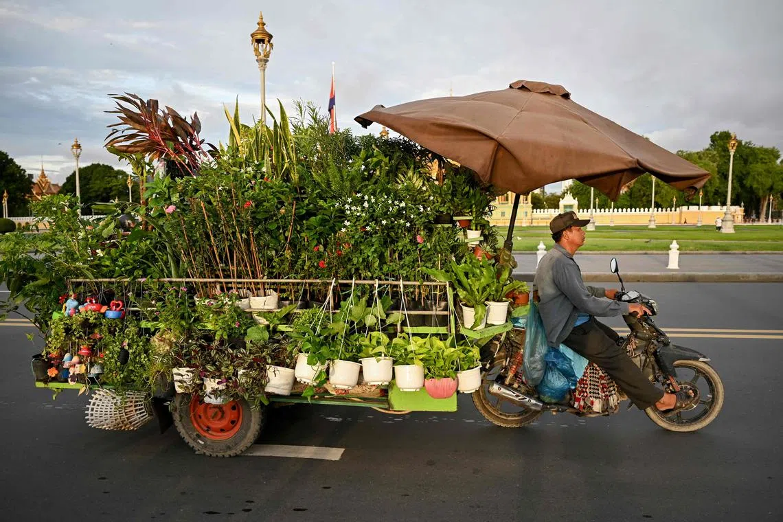A vendor rides a motor-cart loaded with flowers and plants for sale along a street in Phnom Penh, Cambodia, on June 27, 2024.