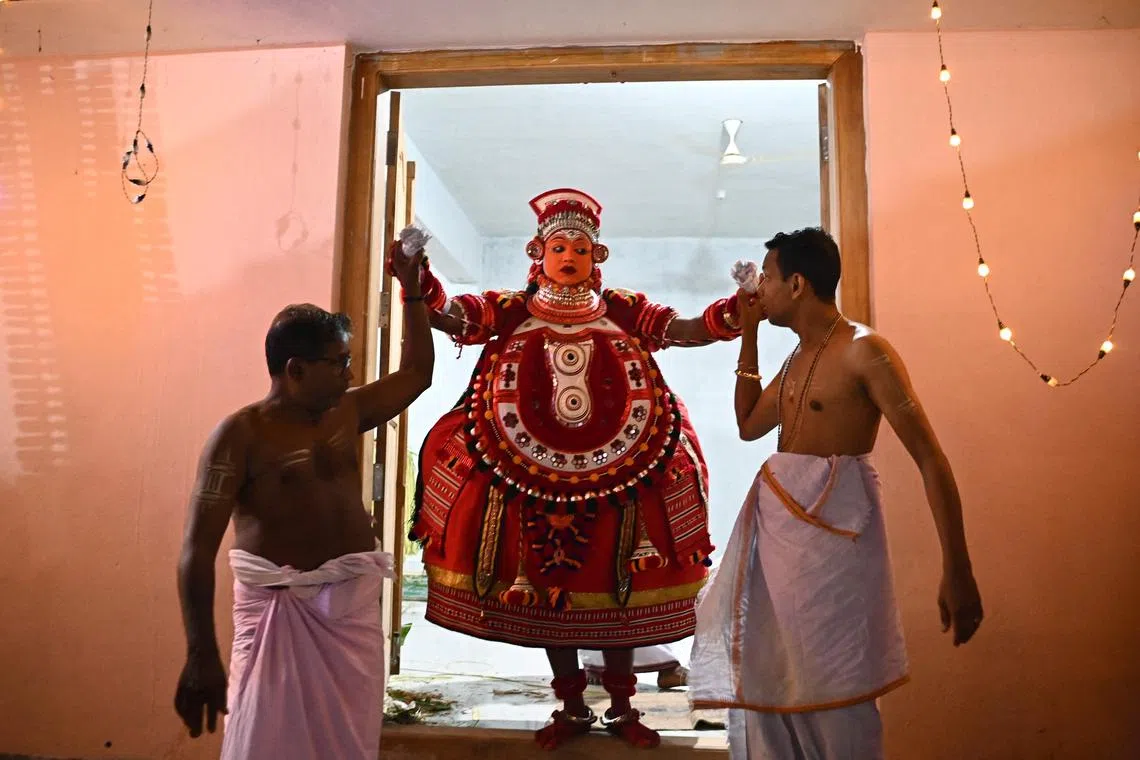 A man dressed as the Hindu deity Sasthappan arriving to perform during the traditional dance festival Theyyam, also known as Kaliyattam, at Muthappa Swami temple in Somwarpet, on March 18, 2024.