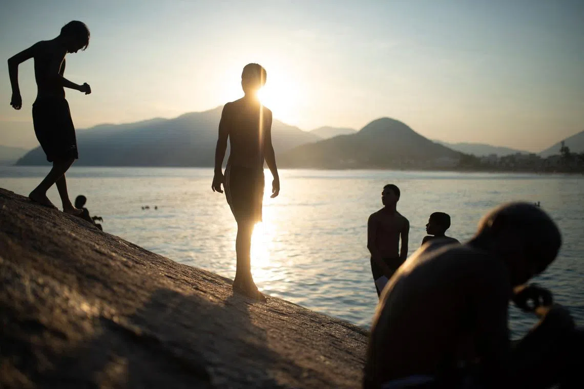 People enjoying the Recreio dos Bandeirantes beach amid a heatwave in Rio de Janeiro, Brazil, on March 17, 2024. A new heatwave is hitting Brazil with record temperatures, which drove residents of Rio de Janeiro and Sao Paulo on March 17 to pour into beaches and parks.