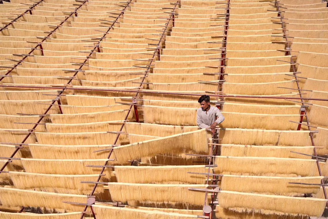 A worker drying handmade vermicelli used to make traditional delicacies popularly consumed by Muslim devotees during the Islamic holy fasting month of Ramadan, in Hyderabad, on March 18, 2024.
