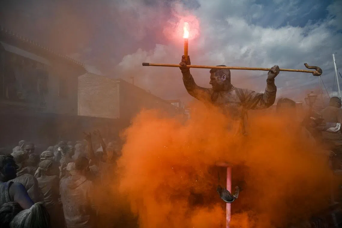A man holding a coloured smoke bomb as he took part in the traditional Flour War, marking Clean Monday in the town of Galaxidi, central Greece, on March 18, 2024. This annual custom, which originated in the 19th century at the end of the carnival season, always falls on Clean Monday, the public holiday that marks the start of the Great Lent.