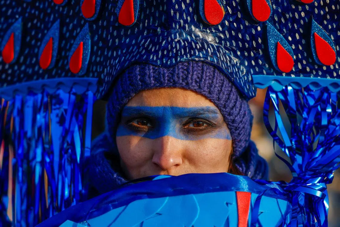 A reveller taking part in celebrations of Maslenitsa, a pagan holiday marking the end of winter, in the village of Nikola-Lenivets in Kaluga region, Russia, on March 16, 2024.