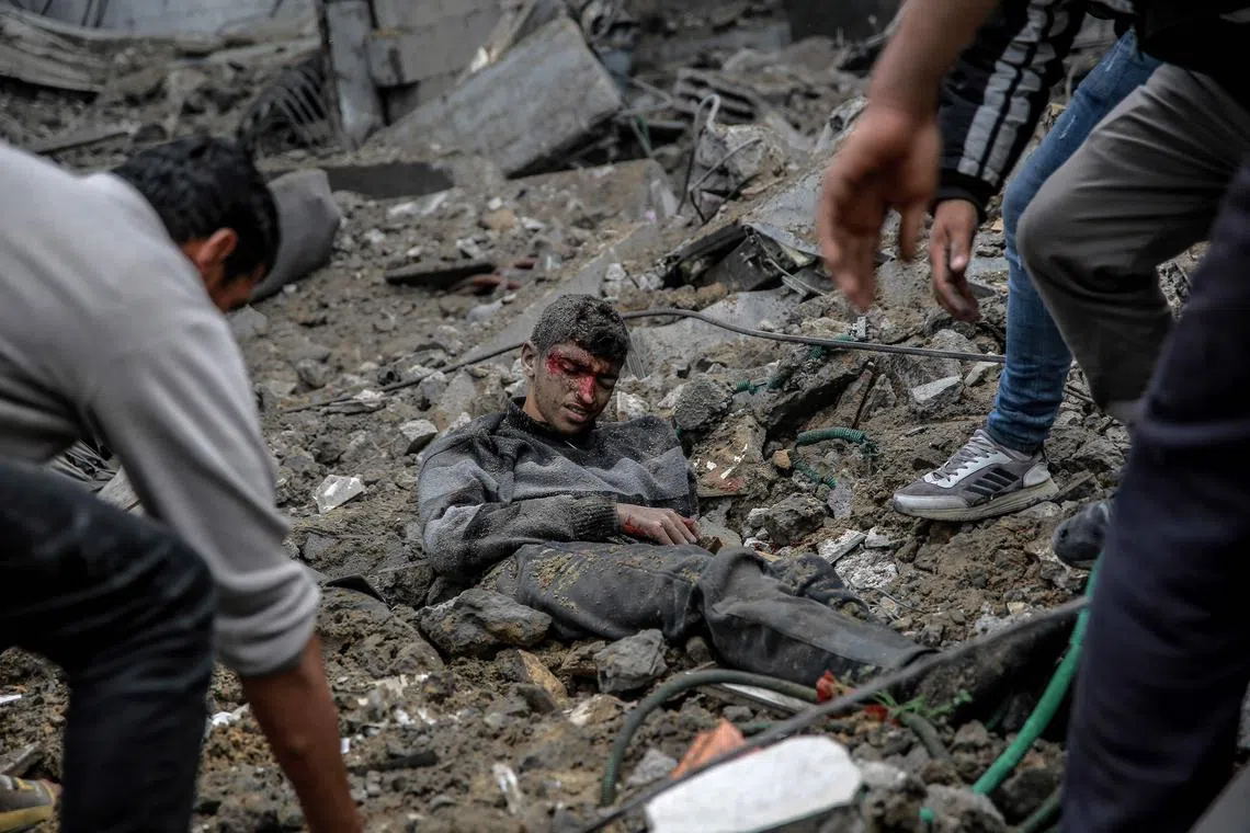 Palestinians rushing to the aid of a wounded youth after Israeli bombardment in central Gaza City on March 18, 2024, amid ongoing battles between Israel and militant group Hamas.