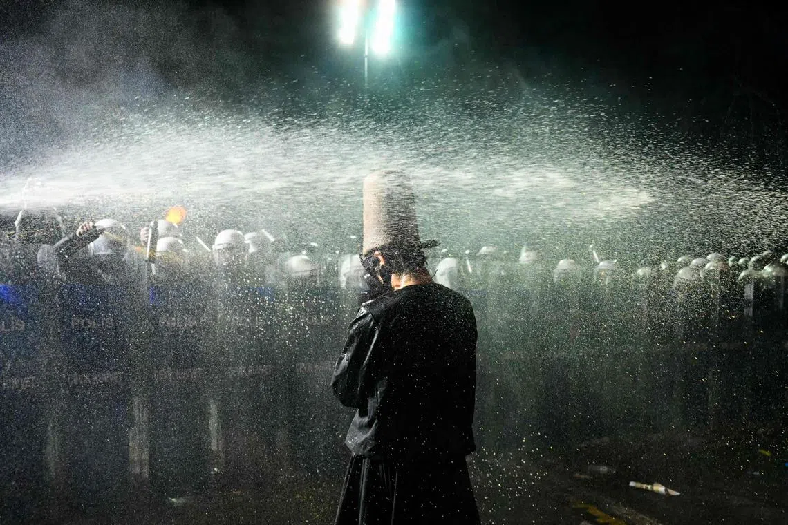 A whirling dervish standing in front of Turkish anti-riot police officers using pepper spray to disperse protesters during a rally in support of Istanbul's arrested mayor in Istanbul Municipality, on March 23, 2025.