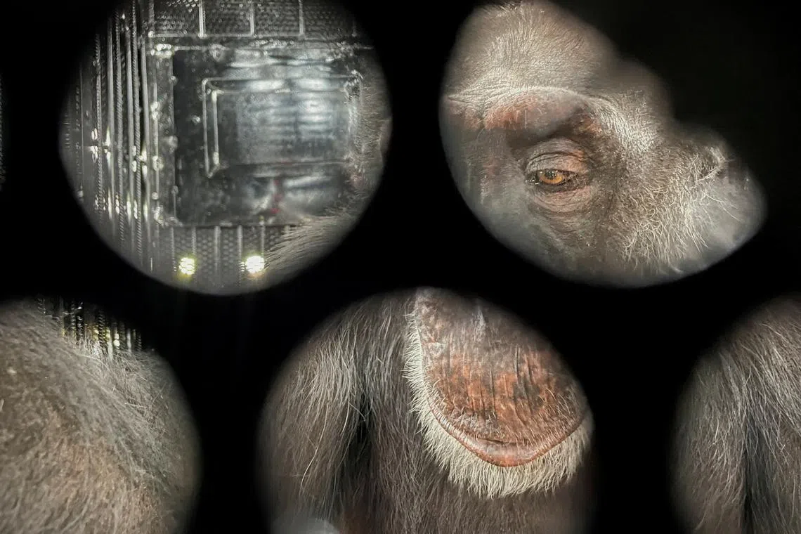 Yoko, the only known great ape in captivity in Colombia, rescued after suffering animal abuse, is transported in a container inside El Dorado International Airport, ahead of his relocation to Brazil's Sorocaba Sanctuary, in Bogota, Colombia, on March 23, 2025.