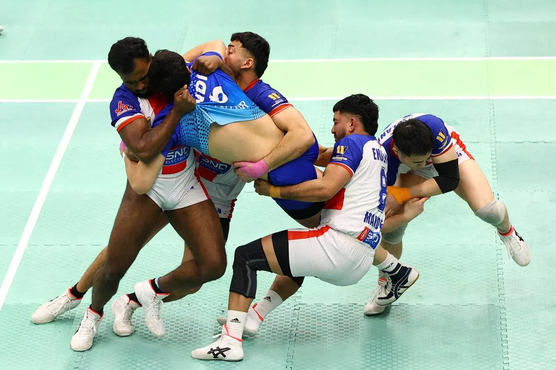 India's Balraj Singh in action against a few England players during the Men's Kabaddi World Cup Final between India and England in Wolverhampton, Britain, on March 23, 2025.