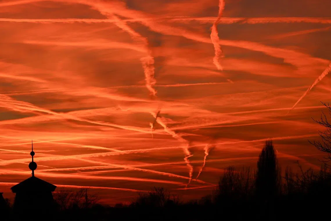 Striking contrails covering the sky above the Berlin Lichterfelde area during sunset in Germany on March 3, 2025.
