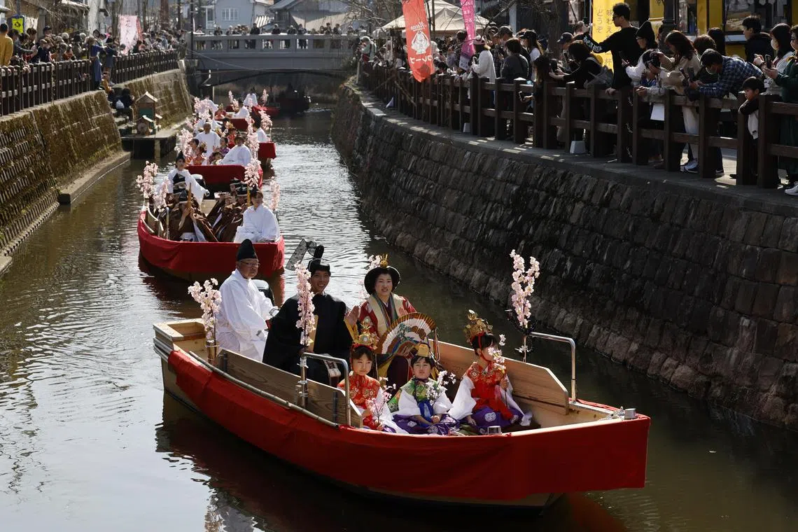 A colourful parade of flat-bottomed boats along the Ono River in Sawara on March 2, 2025. Hinamatsuri, also known as Doll's Day or Girls' Day, is a special day celebrated annually in March in Japan.