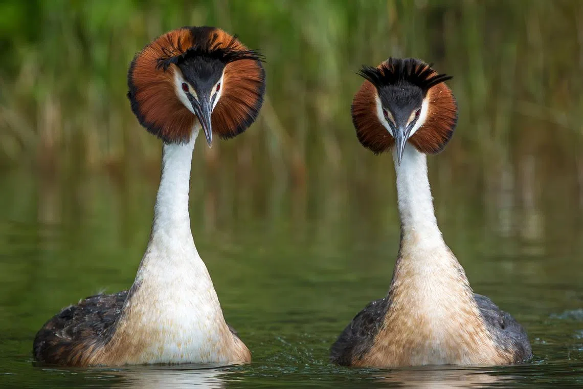 Australasian crested grebes, known in New Zealand by their Maori name "puteketeke", in Lake Alexandrina in New Zealand's South Island. The bird, which has a bizarre mating dance, has won New Zealand's annual avian beauty contest.