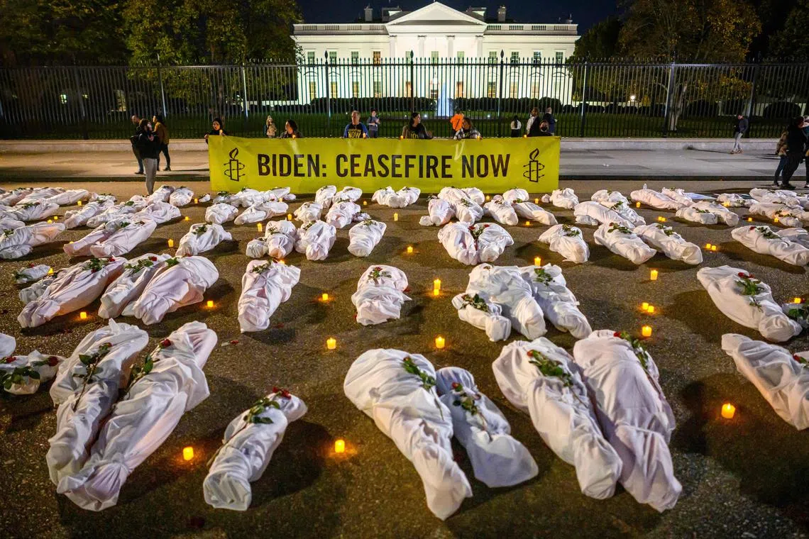 White-shrouded body bags representing victims in the Israel-Hamas conflict during a vigil in front of the White House on Nov 15.