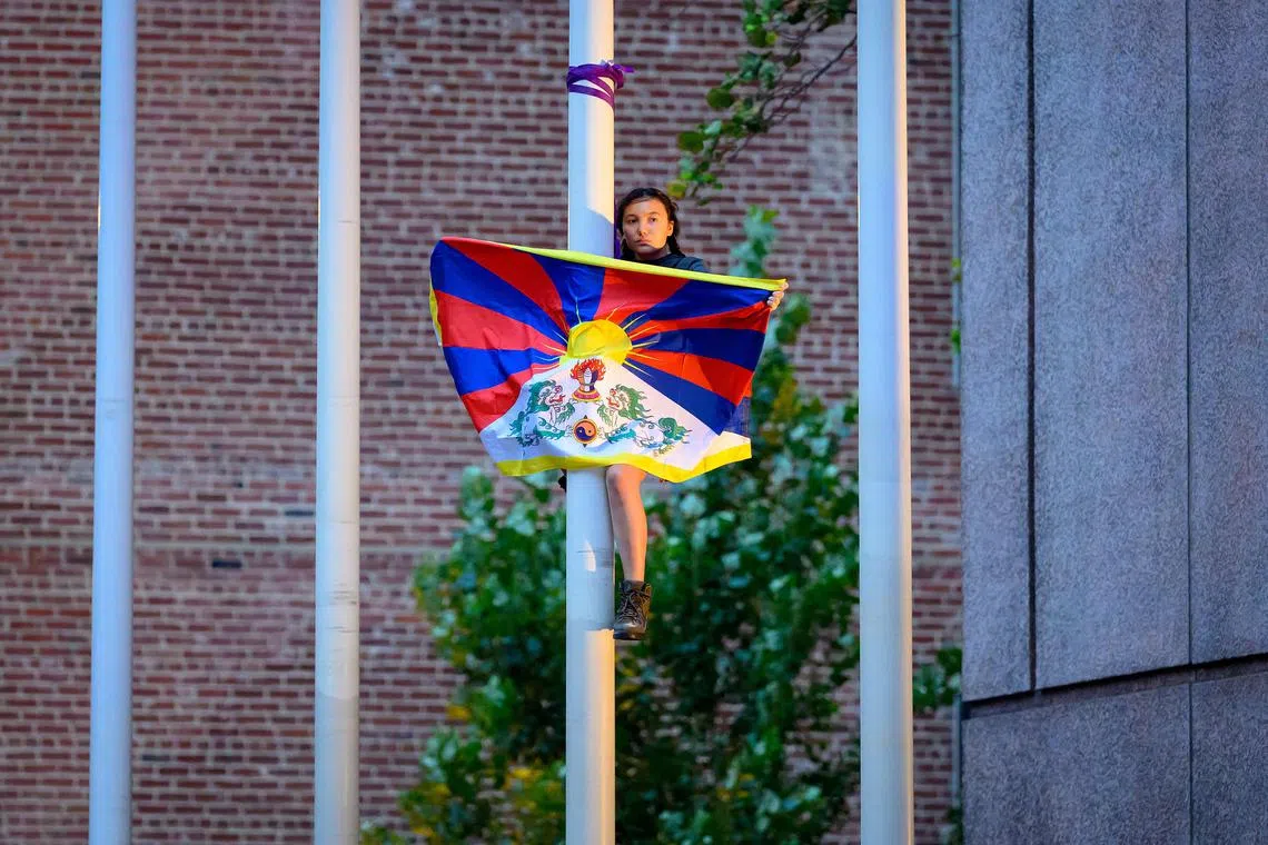 A pro-Tibet protester sitting suspended on a flag pole at a Hyatt Regency Hotel during demonstrations at the Asia-Pacific Economic Cooperation leaders' week in San Francisco, California, on Nov 15.