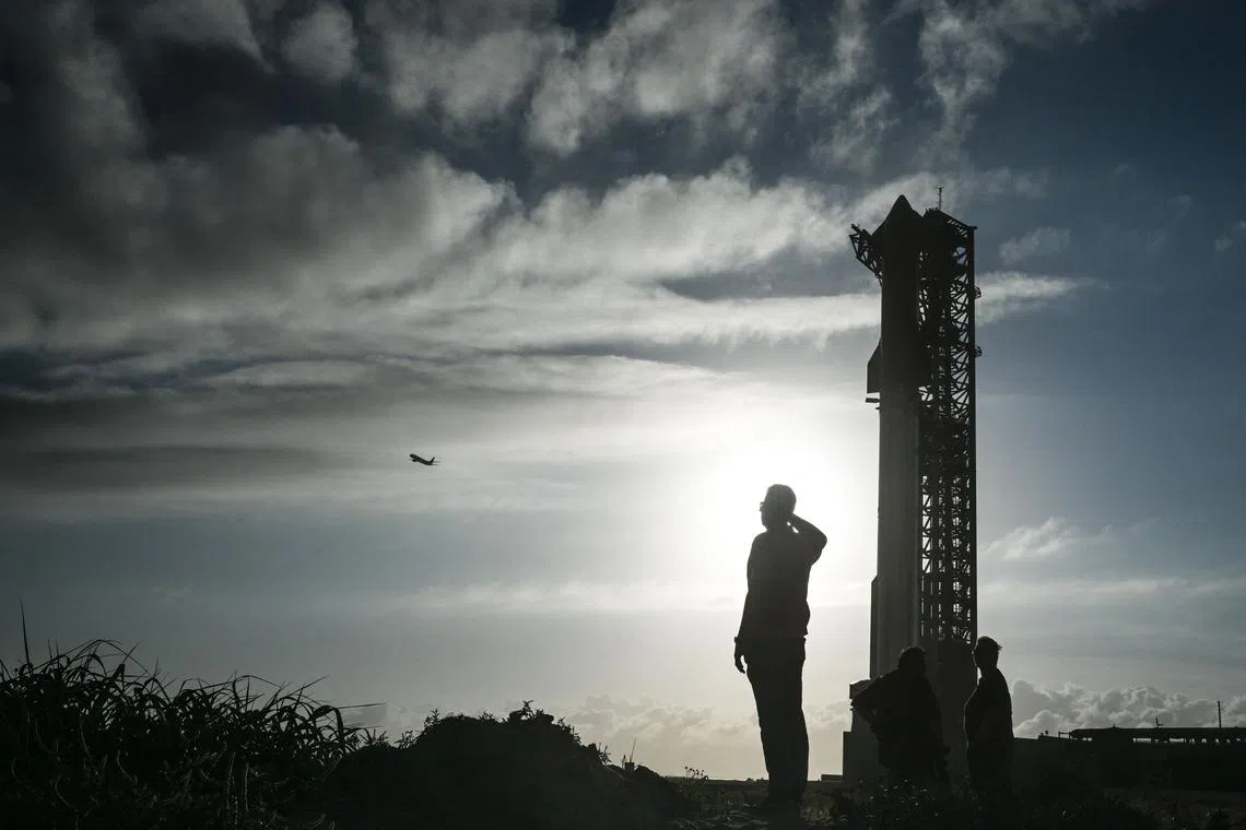 A man watching a SpaceX plane as it flies past the SpaceX Starship at the launch pad ahead of its sixth flight test from Starbase in Boca Chica, Texas, on Nov 17, 2024. The test is scheduled for Nov 19.
