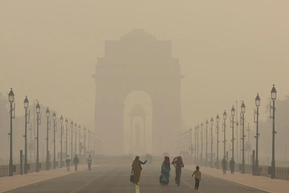 Women walking along a road near the India Gate as the sky is enveloped with smog in New Delhi, India, after Delhi's air quality worsened due to air pollution, on Nov 19, 2024.