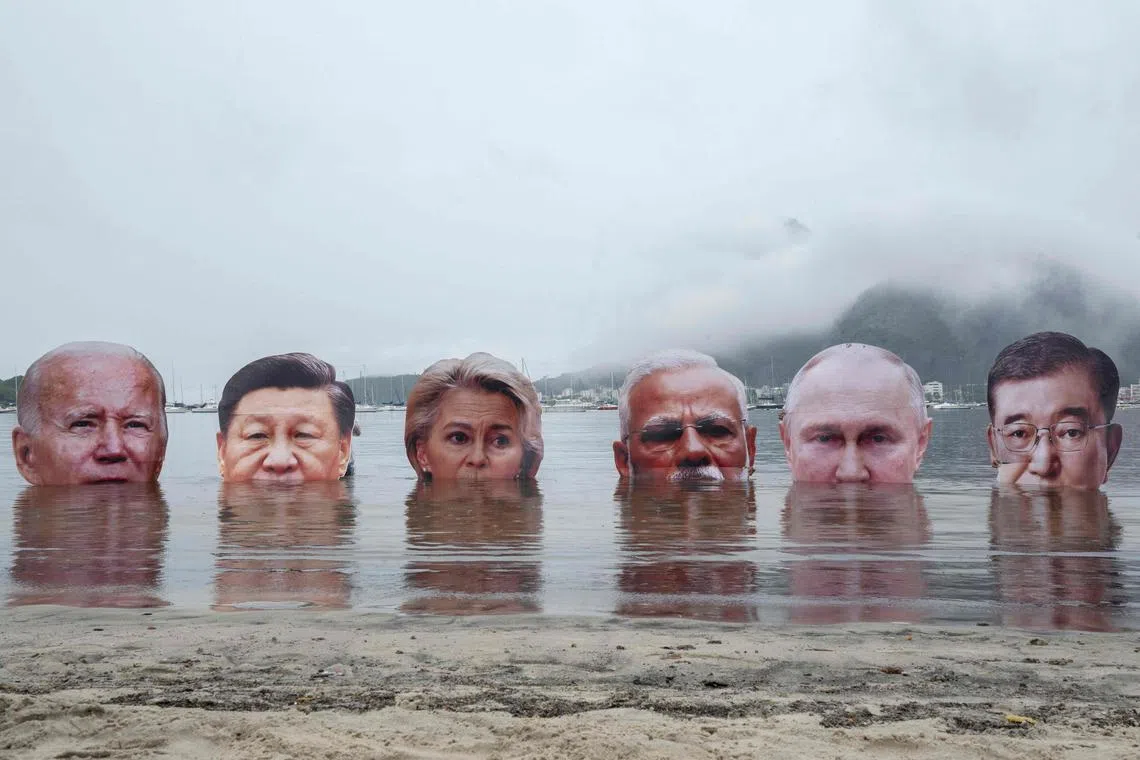 Giant portraits of US President Joe Biden (from left), China's President Xi Jinping, President of the European Commission Ursula von der Leyen, India's Prime Minister Narendra Modi, Russia's President Vladimir Putin and Japan's Prime Minister Shigeru Ishiba are submerged by indigenous people to protest the lack of leadership among the world's richest nations in addressing the climate and biodiversity crisis in Rio de Janeiro, Brazil, on Nov 17, 2024, ahead of the Group of 20 leaders' summit.