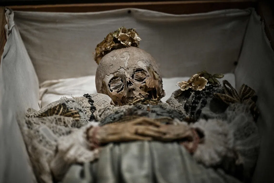 A French mummy named Young Girl From Strasbourg is displayed during the press visit of Momies, an exhibition at the Musee de lHomme in Paris, France, on Nov 18, 2025.