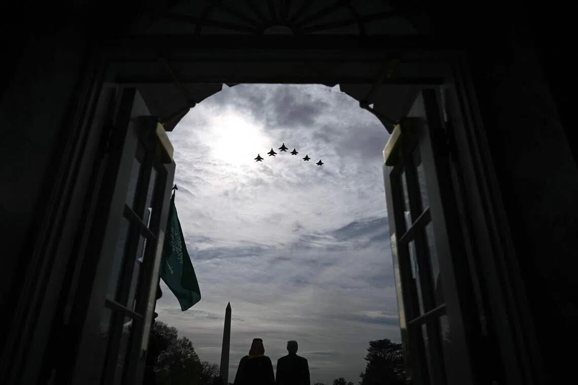 US President Donald Trump (right) and Crown Prince and Prime Minister of the Kingdom of Saudi Arabia Mohammed bin Salman Al Saud watching a flyover of military aircraft on the South Lawn of the White House in Washington, US, on Nov 18, 2025.