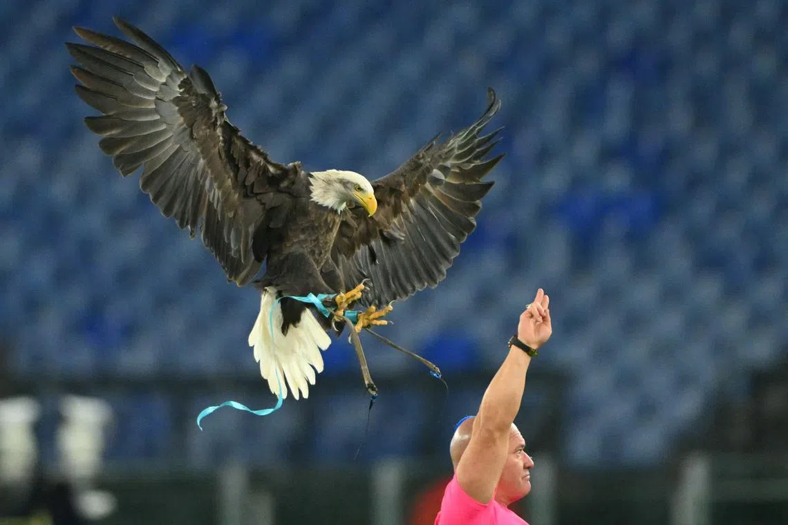 Lazio's mascot, the eagle "Olimpia", flying back to falconer Jose Maria Bernabe before the Uefa Europa League football match between Lazio and Ludogorets at the Olympic Stadium in Rome, on Nov 28, 2024.
