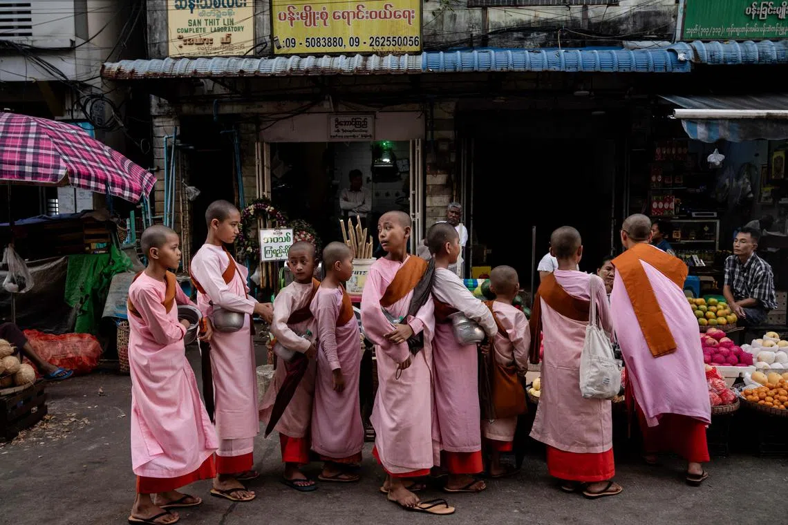 Buddhist nuns collecting alms on a street in Yangon, Myanmar on Nov 28, 2024.