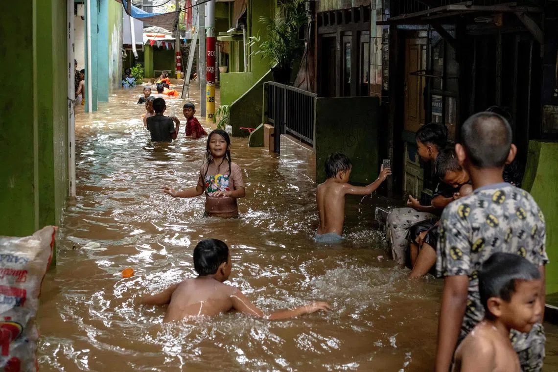 Children playing in the floodwaters resulting from overflow from a river after heavy rain in Jakarta, Indonesia on Nov 28, 2024.