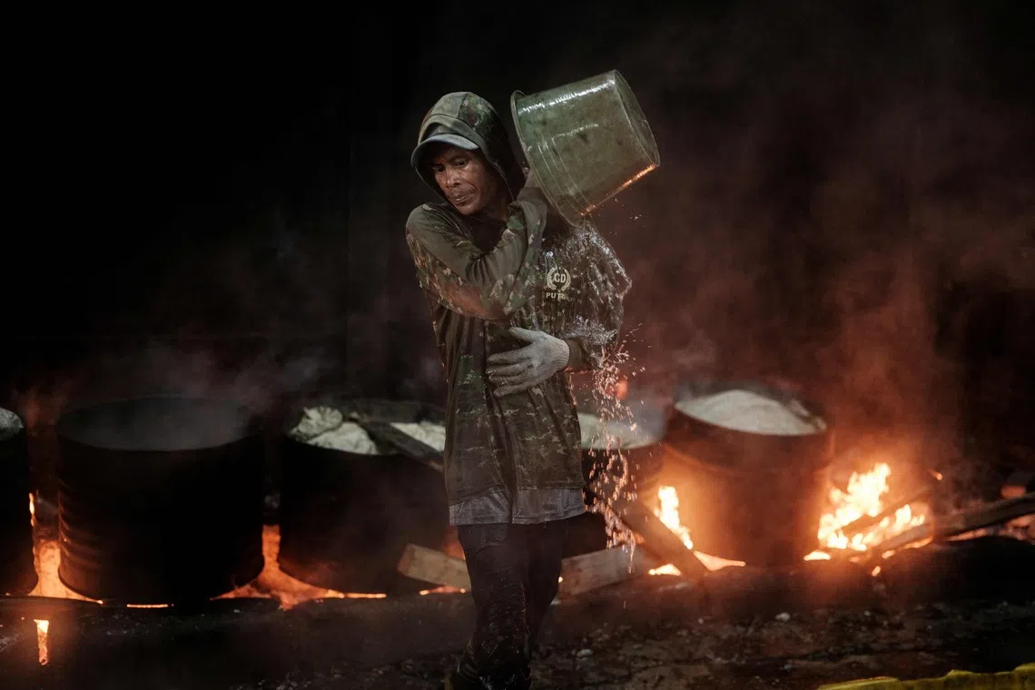 A worker pouring water over himself to cool down from the heat as he boils green mussels at a processing site in Cilincing, North Jakarta, Indonesia, on Nov 5, 2025.