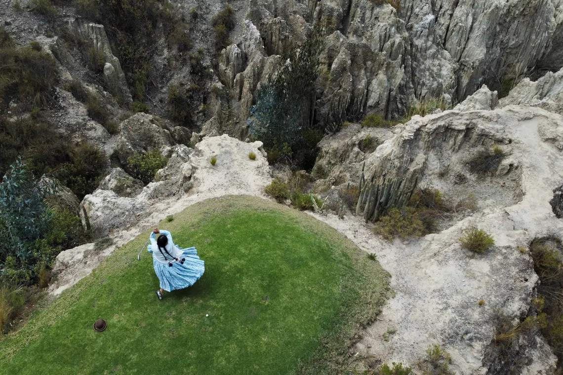 A drone view showing Cholita golfer Martha Mamani, one of the last Aymara women practising the sport wearing traditional pollera skirts, playing at La Paz Golf Club in La Paz, Bolivia, on Sept 29, 2025.