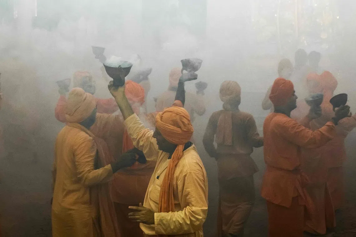 Hindu devotees performing Dhunuchi Naach, a traditional dance form, in front of an idol of goddess Durga during a religious ritual known as aarti, as part of the Durga Puja festival in Varanasi, India, on Sept 30, 2025.