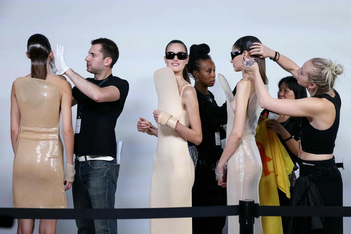Models getting ready to show creations by Courreges during the first look presentation for the women's ready-to-wear Spring-Summer 2026 collection as part of the Paris Fashion Week in France on Sept 30, 2025.