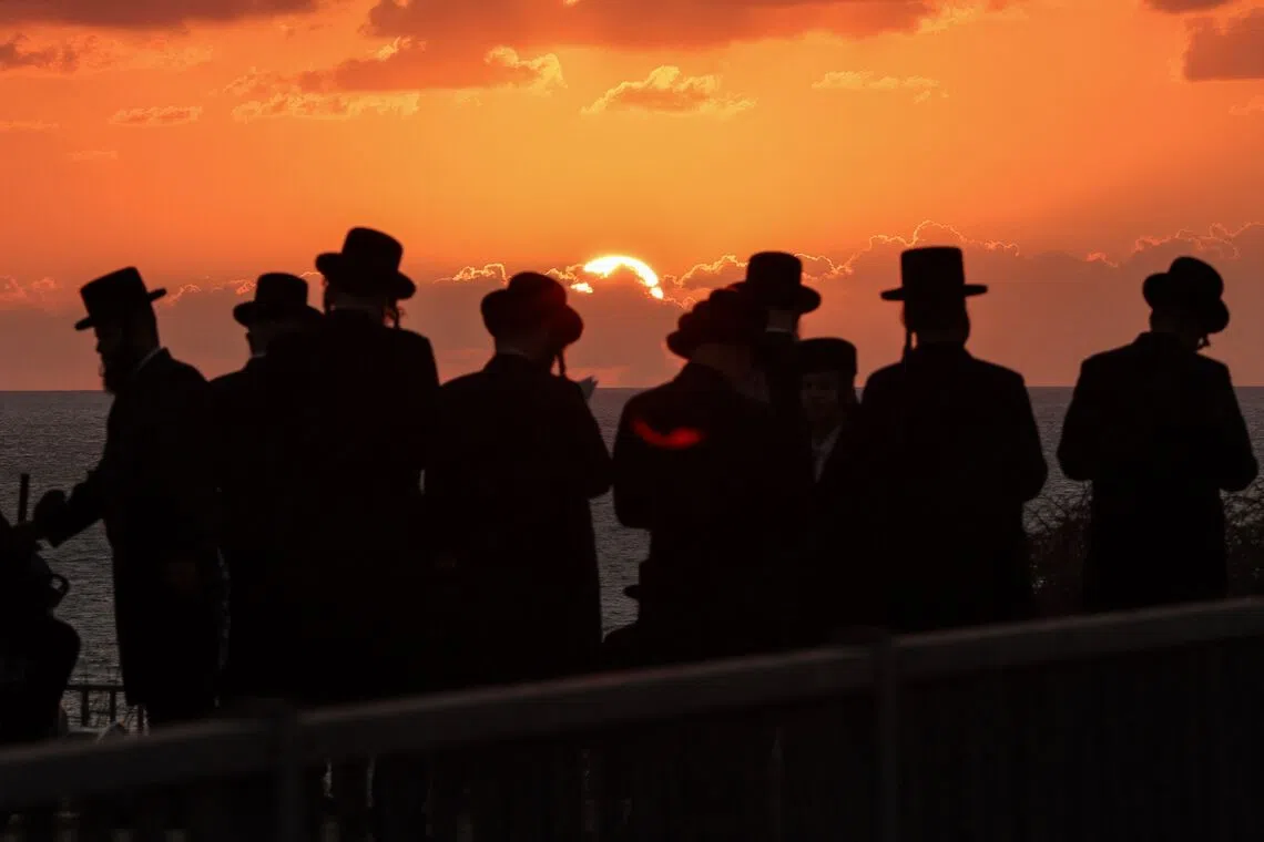 Ultra-Orthodox Jewish men performing the Tashlich ritual, during which "sins are cast into the water to the fish", in Israel's coastal city of Netanya on Sept 30, 2025, ahead of Yom Kippur, the most important day in the Jewish religious calendar, which starts at sunset on Oct 1.
