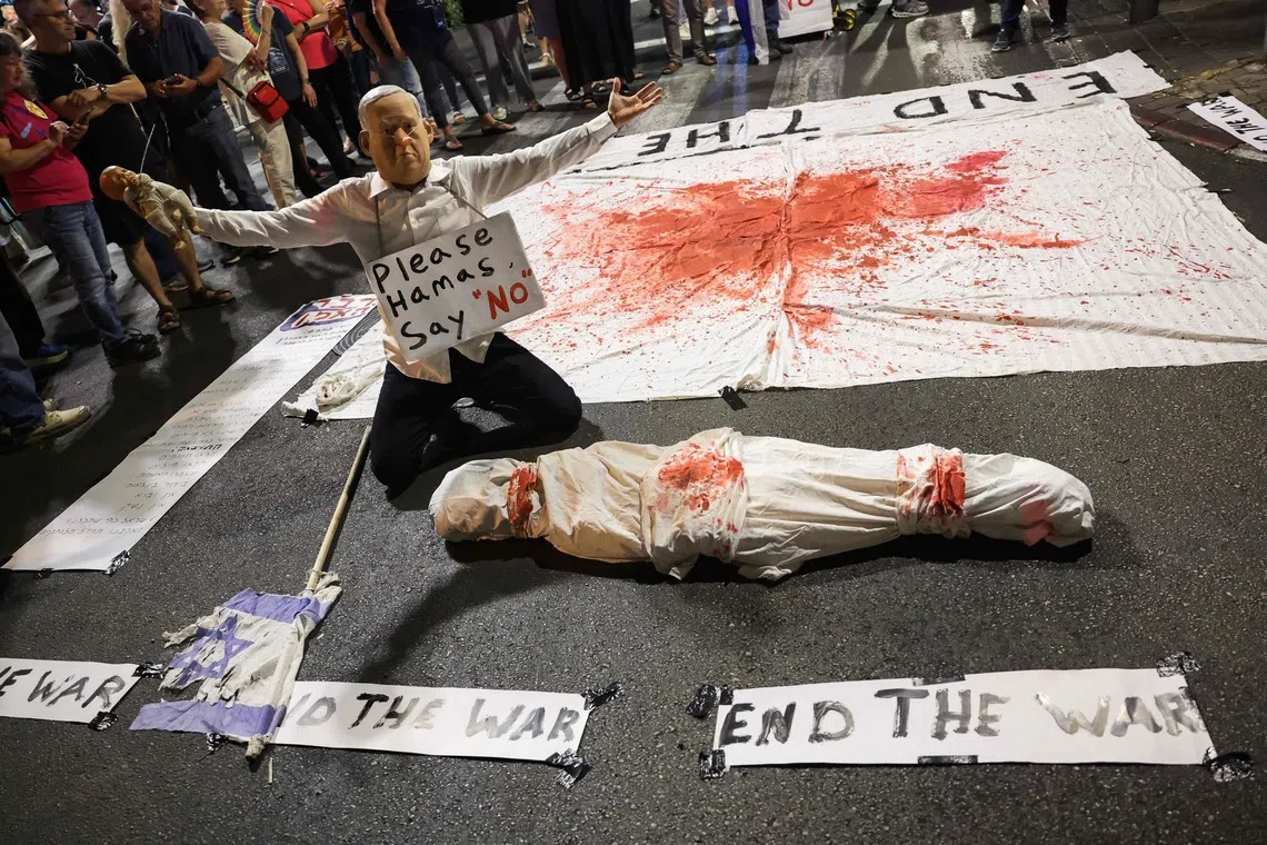 A demonstrator in an Israeli Prime Minister Benjamin Netanyahu mask takes part in an installation during an anti-government protest calling for a ceasefire and for action to secure the return of Israelis held hostage in Gaza, in front of the Likud party building in Tel Aviv, Israel, on Sept 30, 2025.