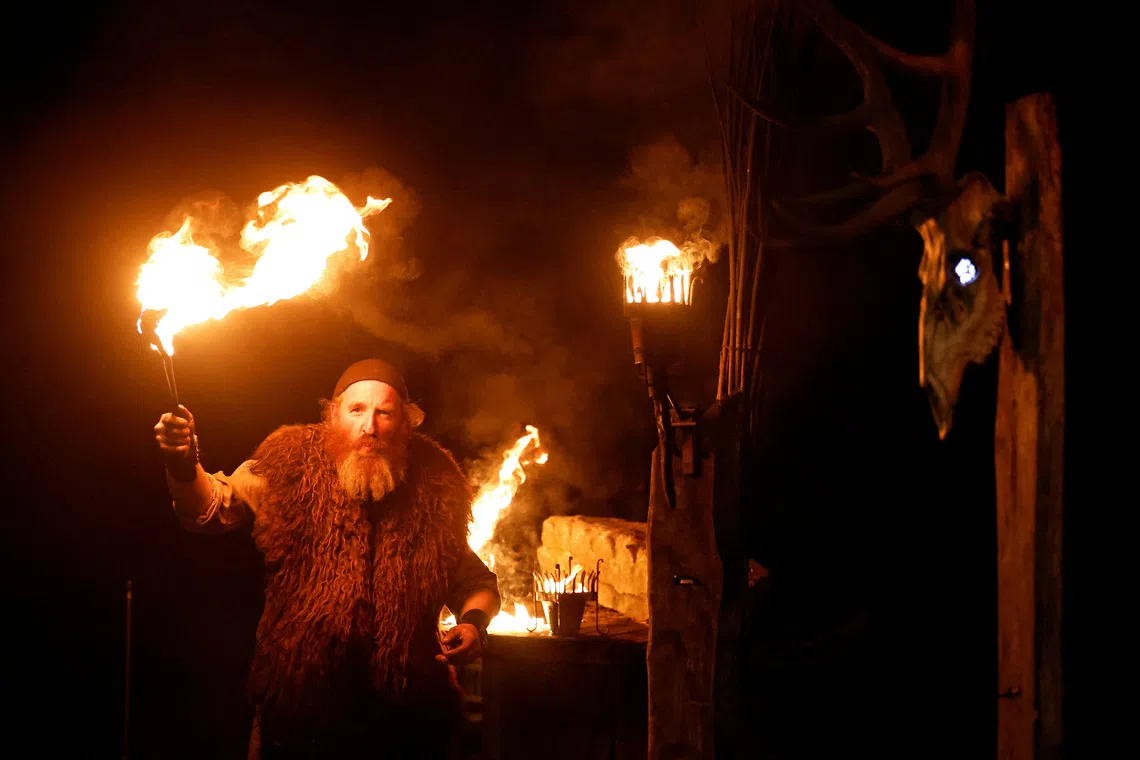Ironmonger Tom King, also known as An Gobha (Irish for "the blacksmith"), guiding tourists on a fire torch walk through a forest at night as part of his immersive ancient Celtic experience, in Bohermeen, Ireland on Sept 30, 2025.