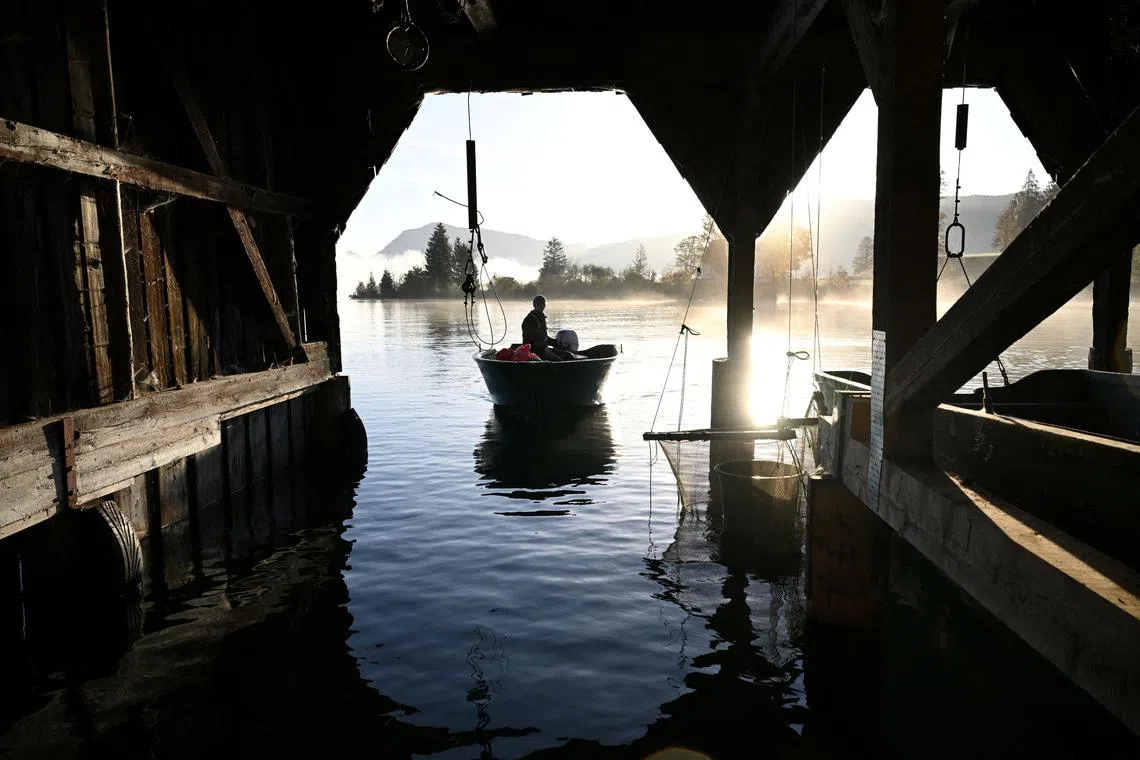A young professional fisherman Kilian Boehm goes home after fishing for perch in the morning hours on the Walchensee, Germany on Oct 21, 2024.