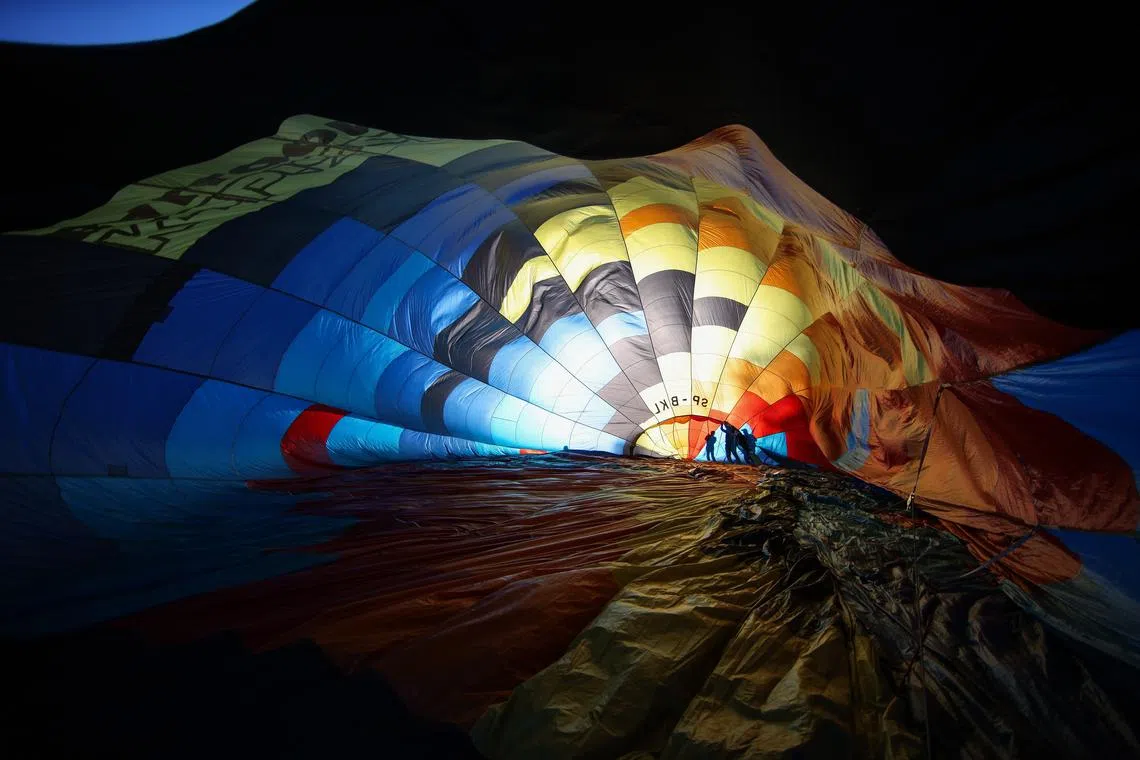 Participants preparing to launch a balloon at the Balloon Fiesta at the Aviation Museum in Krakow, Poland on Oct 19, 2024