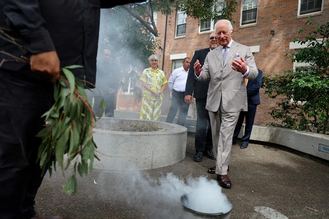 Britain's King Charles takes part in a smoking ceremony during a visit to the National Centre of Indigenous Excellence in Sydney, Australia on Oct 22, 2024.