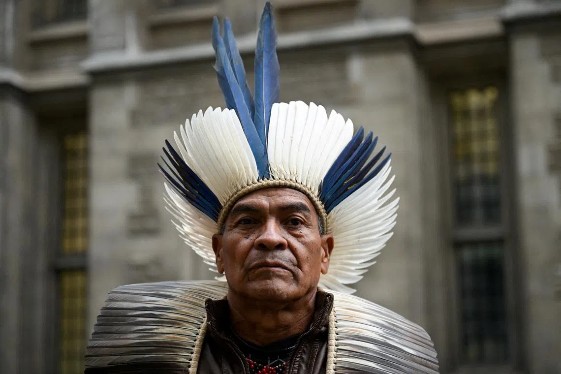 Cacique Bayara, leader of the Pataxo Geru-Tucuna village, located in the municipality of Acucena in Minas Gerais, Brazil, appears outside the Rolls Building of the High Court amid a lawsuit against the BHP Group over the 2015 collapse of the Mariana dam in Brazil, in London, Britain on Oct 21, 2024.