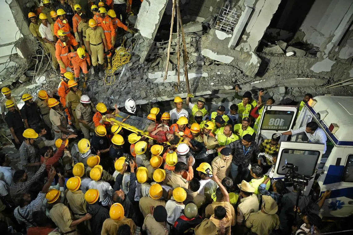 National Disaster Response Force workers carrying a survivor to an ambulance after a search operation after an under-construction building collapsed in Bengaluru, India, on Oct 22.