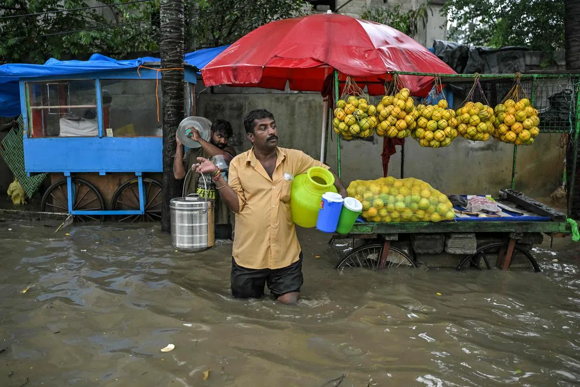 A vendor wading through a flooded street following heavy rainfall in Bengaluru, India, on Oct 22, with weather officials issuing a red alert warning of flash floods and landslides.
