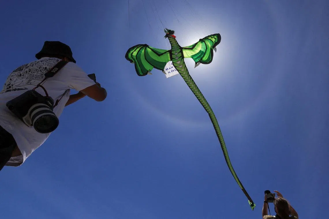 Journalists taking photos of kites during a practice run at Dolphin Beach ahead of this weekend's 30th Cape Town International Kite Festival. This year, kite enthusiasts are gathering to fly kites to raise funds and awareness for mental health support in the South African capital.