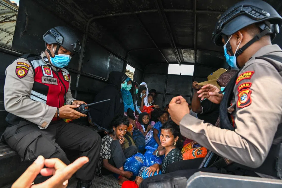 Police officers escorting Rohingya refugees after rescuing them from a boat anchored off the coast of Labuhan Haji, Southern Aceh province, on Oct 24, 2024. The mostly Muslim ethnic Rohingya are heavily persecuted in Myanmar, and thousands risk their lives each year on long and dangerous sea journeys to reach Malaysia or Indonesia’s Aceh province.