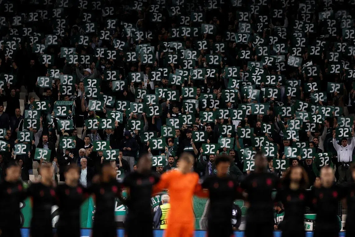 Panathinaikos fans displaying the number 32 during a minute of silence in memory of former player George Baldock, before a Europa Conference League match between Panathinaikos and Chelsea at the Athens Olympic Stadium in Greece, on Oct 24, 2024.