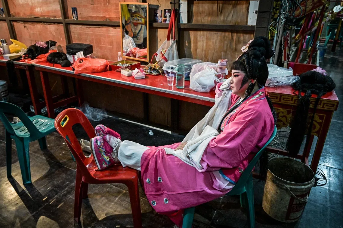 A traditional Chinese opera dancer from Dongshan, Chaozhou, China resting before performing on the first day of week-long shows for the local Chinese community at the Budhi Dharma Temple in Tandem, North Sumatra, Indonesia on Sept 16, 2025.