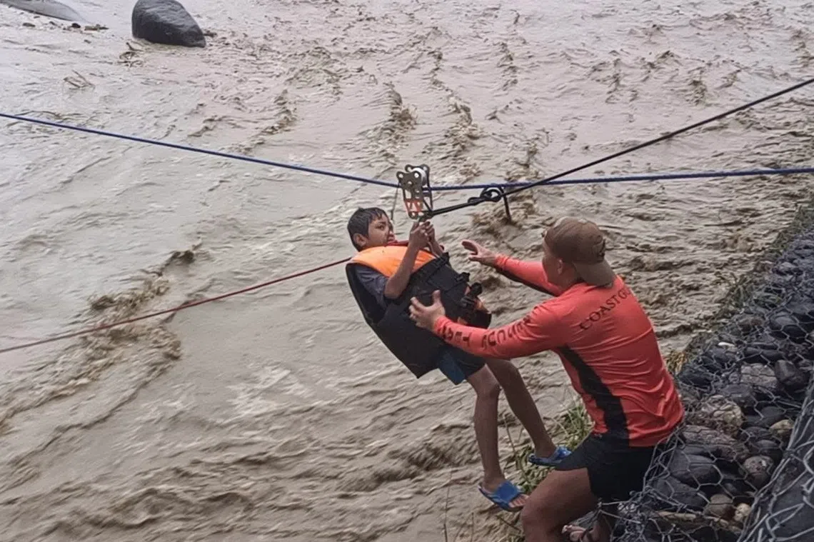 Philippine Coast Guard personnel conducting a rappel rescue in the flood-hit municipality of Salcedo, Ilocos Sur province, on Sept 22, 2025. Super Typhoon Ragasa passed the northern Luzon island, bringing widespread flooding, landslides, and damage to homes and infrastructure across the affected region.