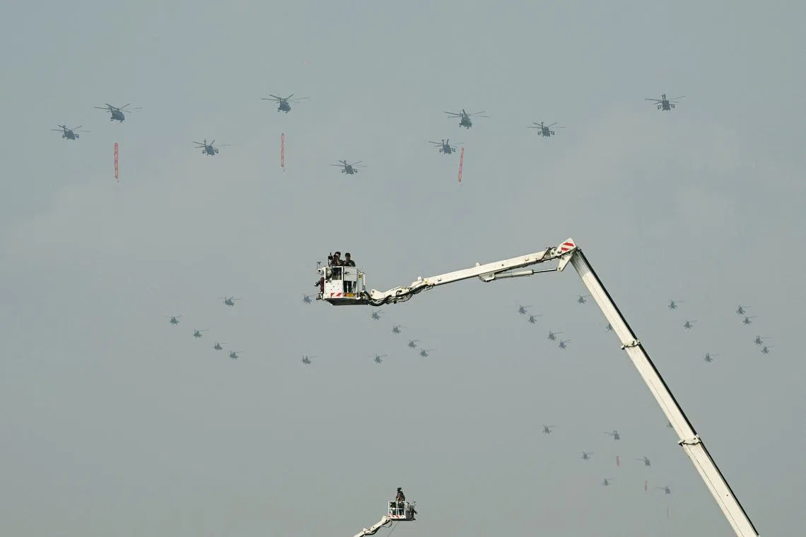 Helicopters flying in formation during China's military parade marking the 80th anniversary of victory over Japan and the end of World War II, in Beijing's Tiananmen Square on Sept 3, 2025.