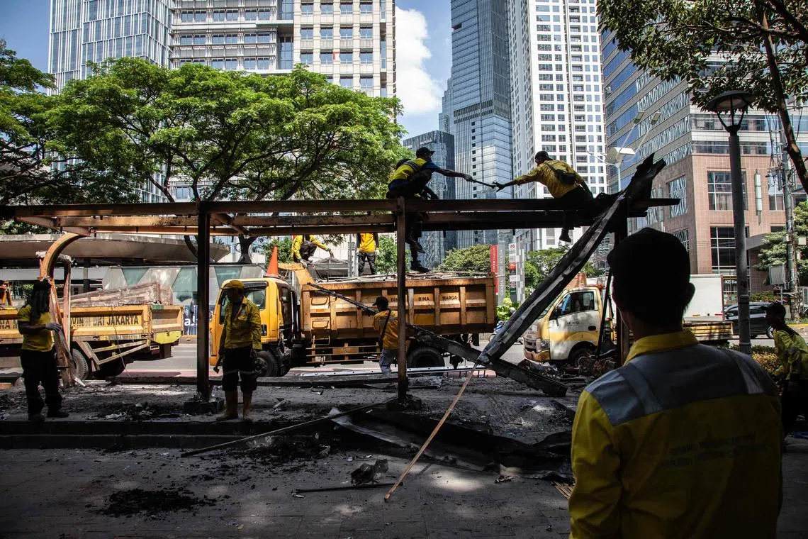 Workers from the Jakarta Facilities and Infrastructure Agency repairing a TransJakarta bus stop, part of Jakarta's bus rapid transit system, which was burned down by protesters near the police headquarters on Sept 2, 2025.