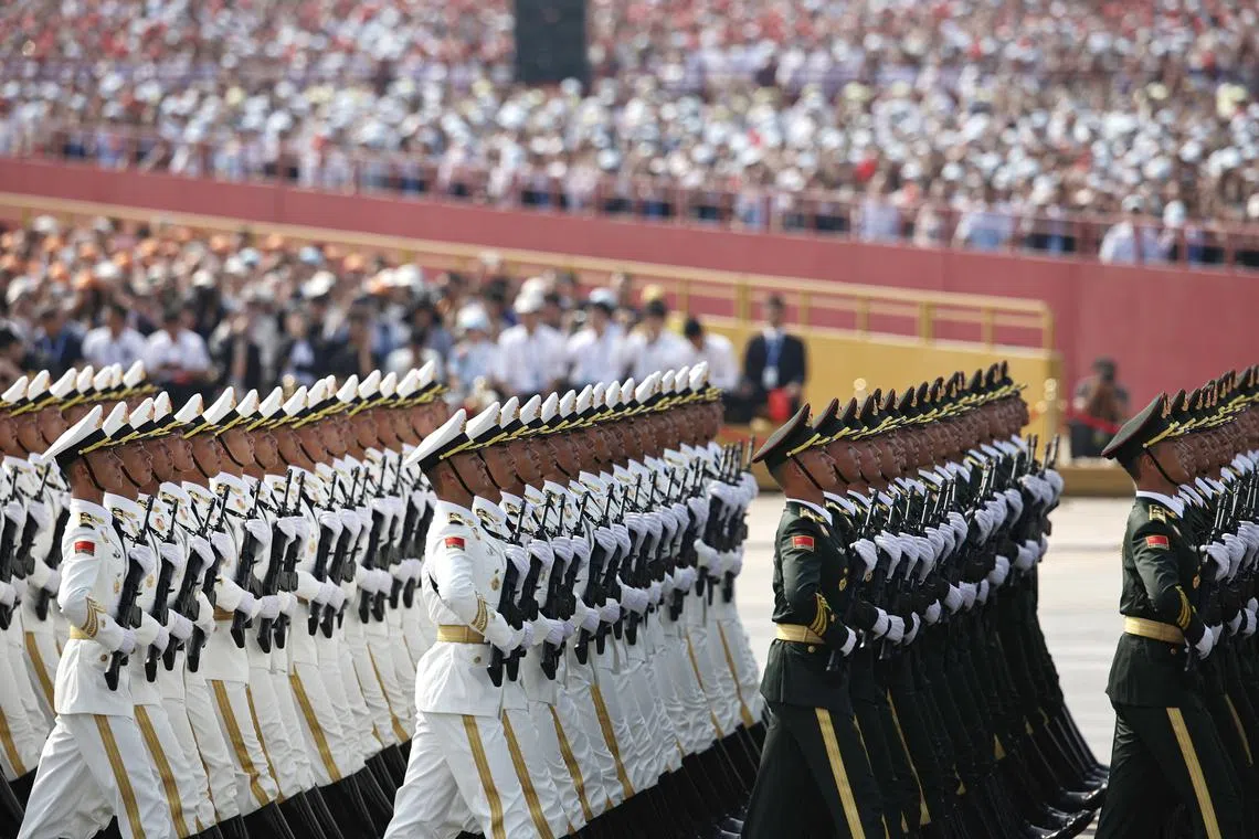 Chinese troops marching during the military parade marking the 80th anniversary of the end of the Sino-Japanese War in Beijing, China, on Sept 3, 2025.