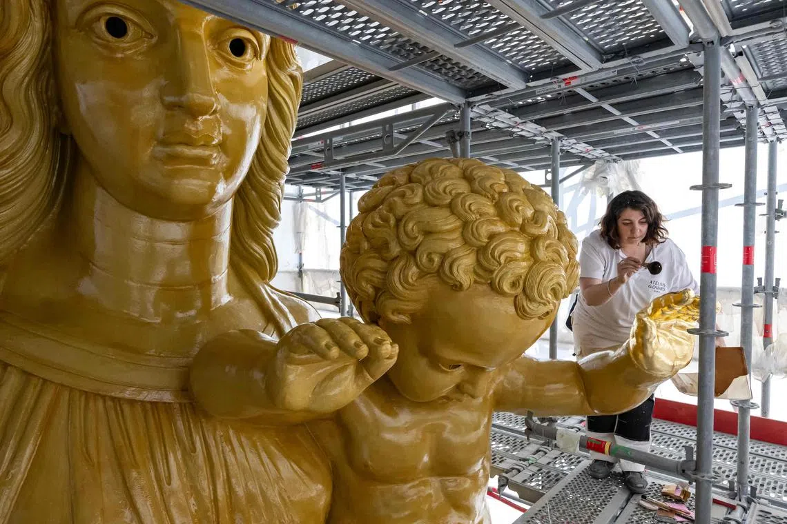 Art restorer Cyrielle D'Antoni working with gold leaves on the statue of Jesus beside Virgin Mary during the renovation of the basilica Notre-Dame de la Garde in Marseille, France on Sept 3, 2025.