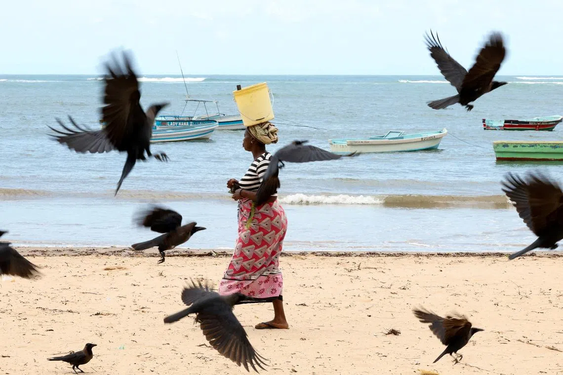 Crows flying by a woman balancing a pail on her head at Baobab Beach in Malindi, Kilifi County, Kenya on Sept 4, 2025.