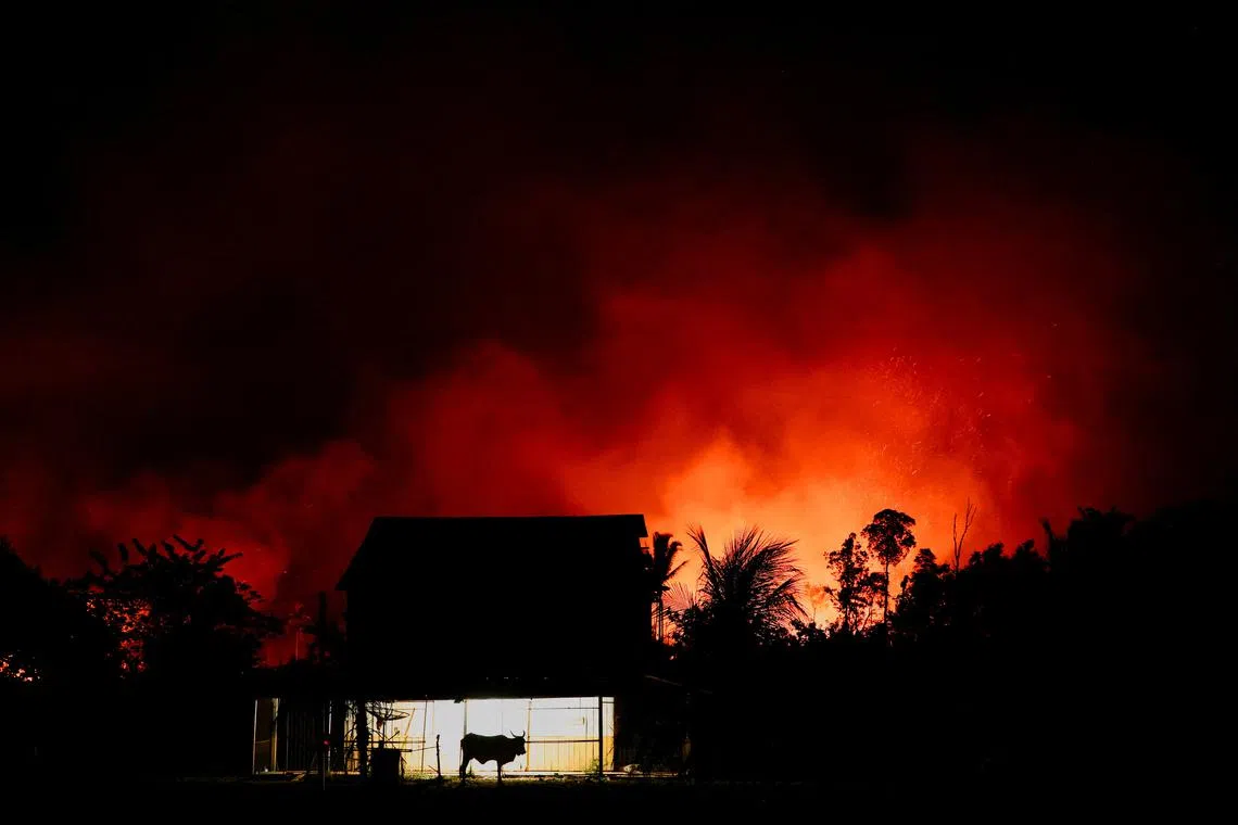A view of a farm near a forest fire in the Amazon in an area of the Trans-Amazonian Highway BR230 in Labrea, Amazonas state of Brazil on Sept 4, 2024.